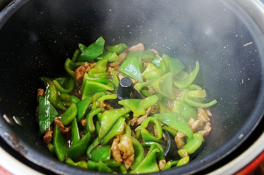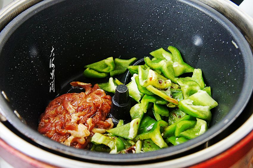 多功能炒菜机自动完成,时间到,打开锅盖,颜色碧绿,口感特好,非常入味,简单好上手,适合厨房小白,无油烟更健康。没有炒菜机,若用炒锅来炒,记住关键步骤,一样好吃。锅中热油先滑入瘦肉翻炒,炒至变色(可取出),加入青椒翻炒,记住关键点,需要淋入一点水,加入调味料,让青椒熟透,颜色更绿,口感更爽,不用芡汁也入味。