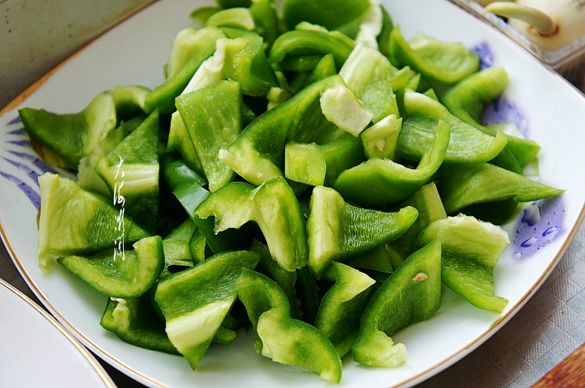 青椒在淡盐水中浸泡10分钟以上,然后反复清洗干净,切大小适中的块备用。