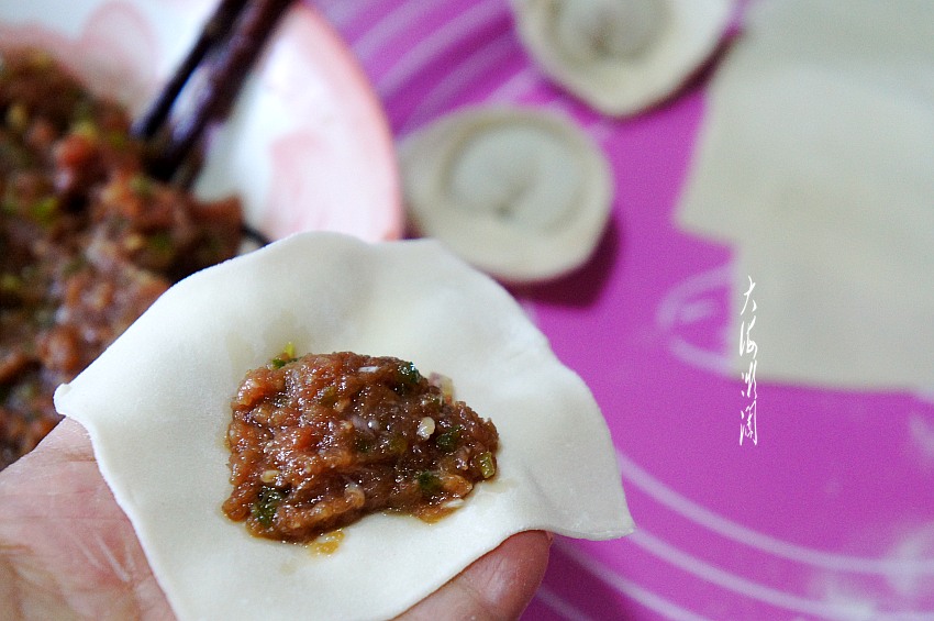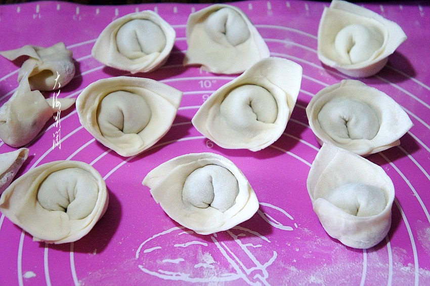 包馄饨其实也很简单,按照自己喜欢的样式包就成了,取一个馄饨皮,放上馅,看看和饺子差不多了,自己做就是实惠,是吧!
