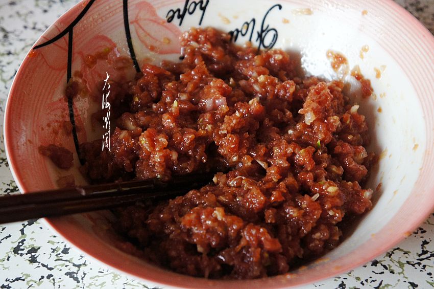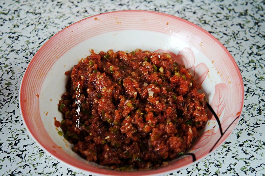 加入青椒馅搅拌均匀,记住不用加盐,这样拌的馅料咸度刚刚好,提倡清淡饮食。