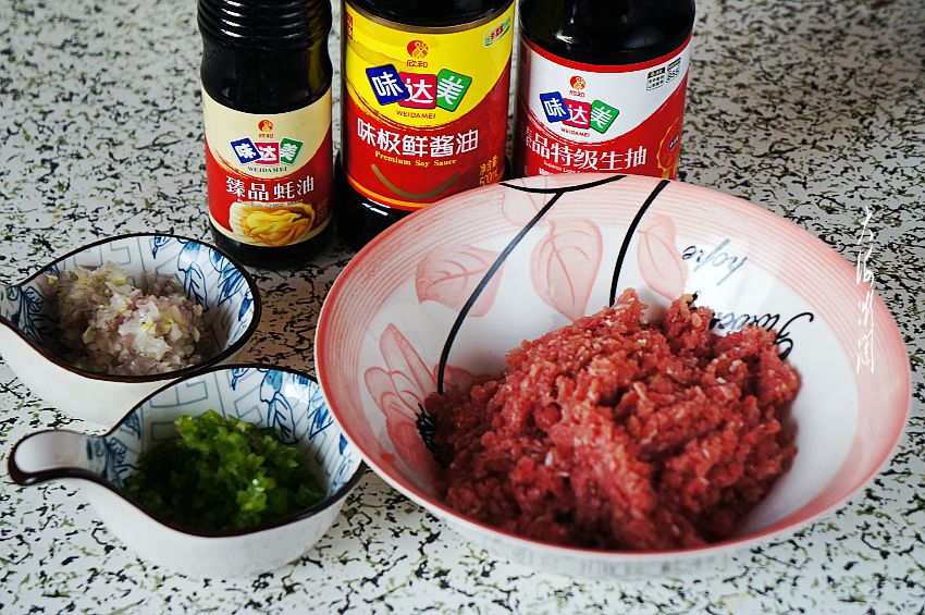 调肉馅:先在猪肉馅里加入1勺料酒搅拌均匀去腥味,然后加入五香粉蘑菇粉,分别加入味达美味极鲜酱油3勺,味达美蚝油2勺,味达美臻品特级生抽1勺,然后加入葱姜末,沿一个方向搅拌均匀即可。可以多搅拌一会让馅料上劲,这样煮出的馄饨吃起来更有嚼头,最后加入适量的橄榄油拌匀,锁住水分。
