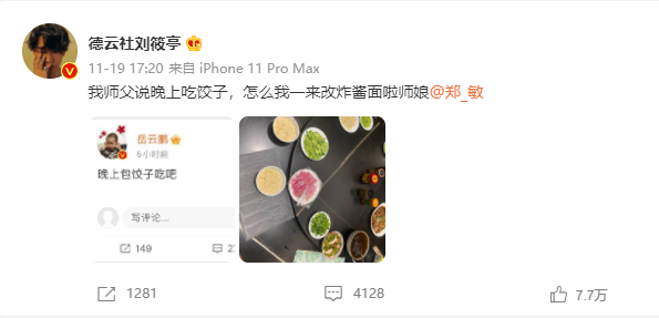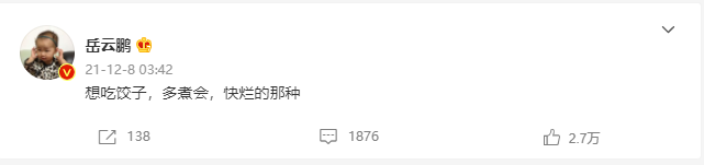 话说岳岳是真的太喜欢吃饺子了。12月8日凌晨还发微博想吃饺子,要煮得快烂的那种,这个时间估计又是在参加某个节目的录制吧!