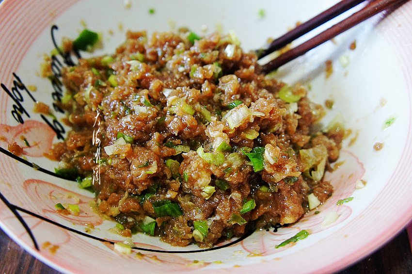 调馅:猪瘦肉洗净剁馅,葱姜去皮洗净切碎,先在猪肉馅里加入1勺料酒搅拌均匀去腥,然后加入五香粉蘑菇粉,分别加入味极鲜酱油3勺,蚝油2勺,生抽1勺,然后加入葱姜末,沿一个方向搅拌均匀即可。最后加入适量的橄榄油拌匀,锁住水分。