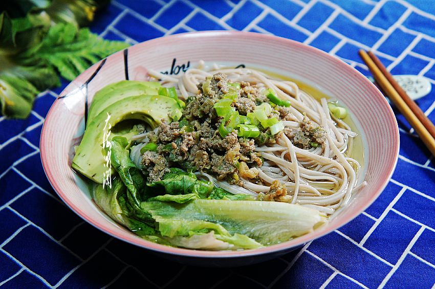 【荞麦面条】所需食材:荞麦面条100g;生菜叶3片;牛油果半个;白胡椒粉适量;盐适量;松茸鲜适量;藤椒油适量;香葱少许;熟里脊肉末适量。
