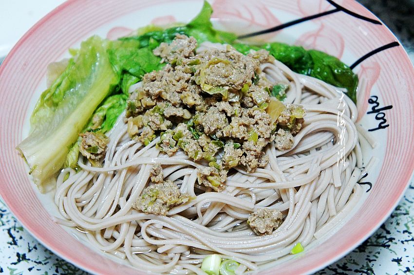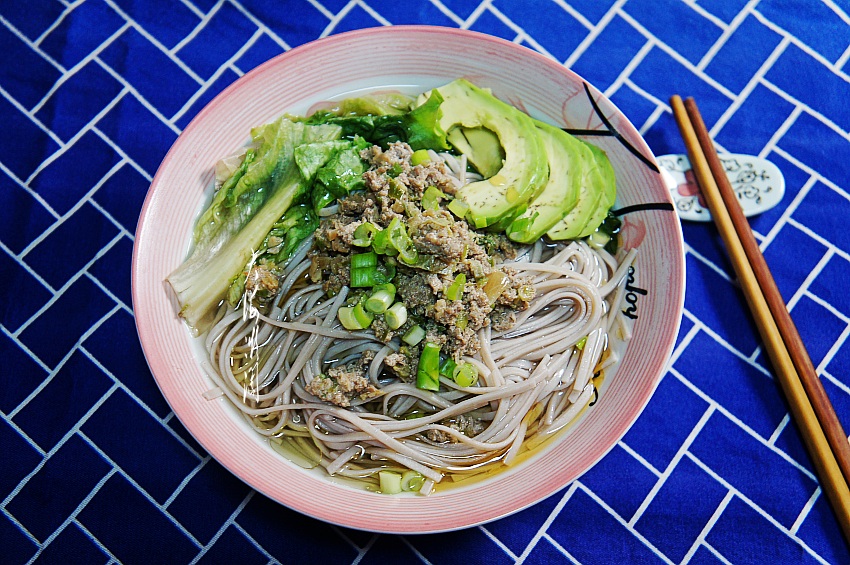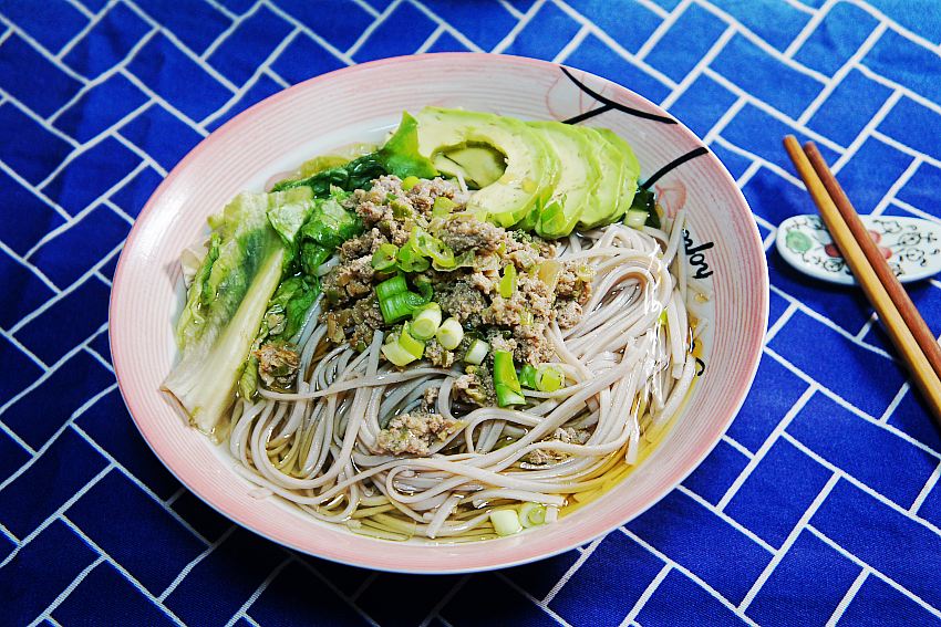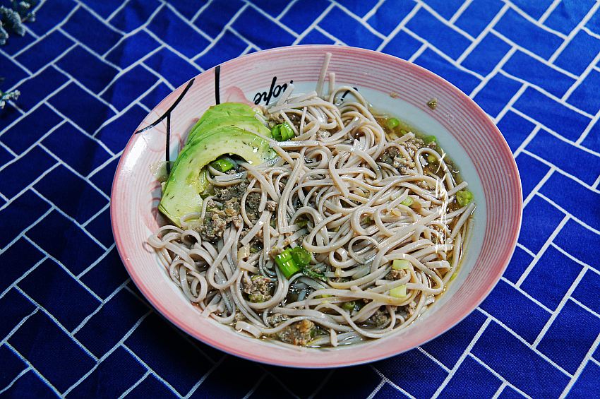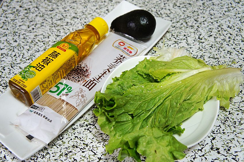 这碗面条主料有三种,荞麦面条、生菜叶和牛油果,别看简单,营养均衡,各有所长,荞麦面条,属于粗粮的一种,非常适合晚餐,低脂低卡,其蛋白质中含有丰富的赖氨酸成分,铁、锰、锌等微量元素比一般谷物丰富,而且含有丰富的膳食纤维,是一般精制大米的10倍,能有效地促进消化,还能促进肠道内废物的排出,有很好的营养保健作用。十分适合用来做减肥期间的早、晚餐,既营养饱腹又不用担心长胖。