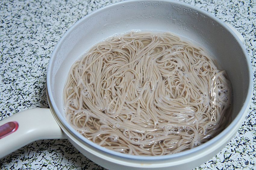 电煮锅加入适量的水,水开下入荞麦面条,大火烧开,转小火,浇点冷水,再次烧开,荞麦面条就煮好了,喜欢凉一点的就过个冷水,我喜欢热面条,可以不用过冷水。
