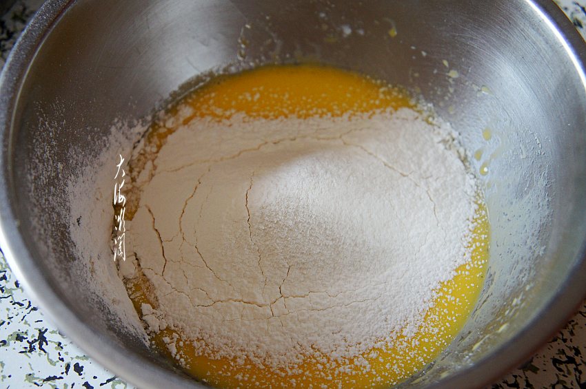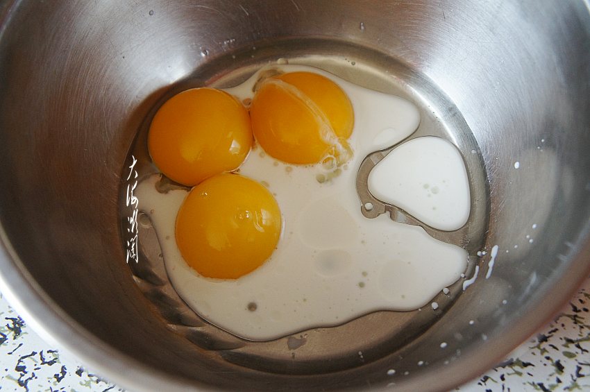 蛋黄中加入20g牛奶、15g色拉油、5g白糖搅拌均匀,充分搅拌蛋黄液至乳化状态。