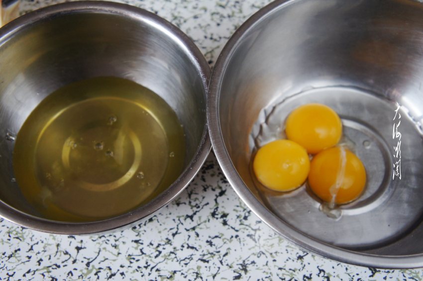 取两个无油无水的容器,将3个鸡蛋蛋白蛋黄分离。