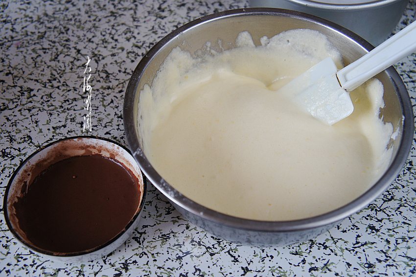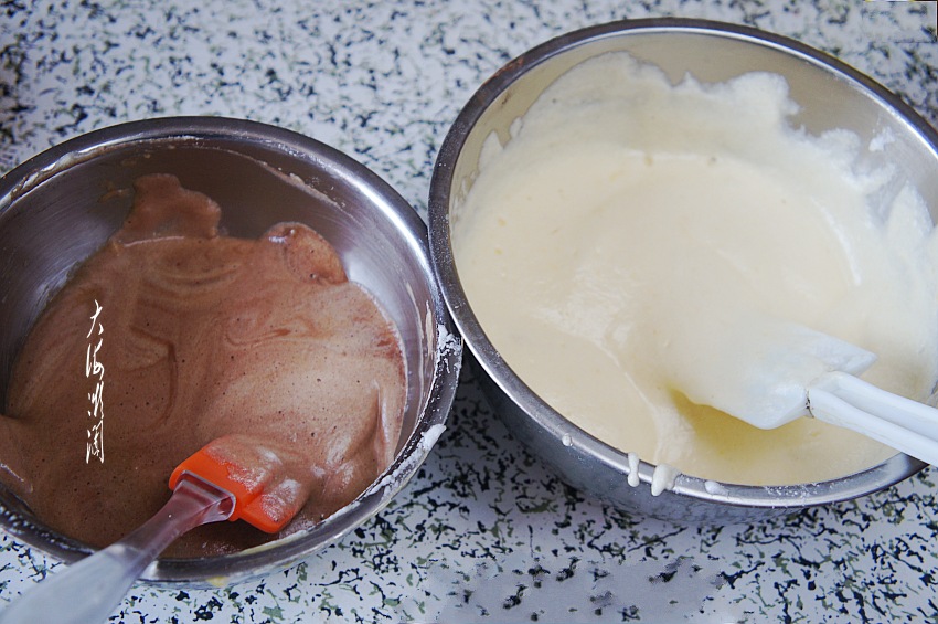 然后把蛋糕糊分成两份,一份加入调好的可可粉,切拌均匀。一份是原味面糊。