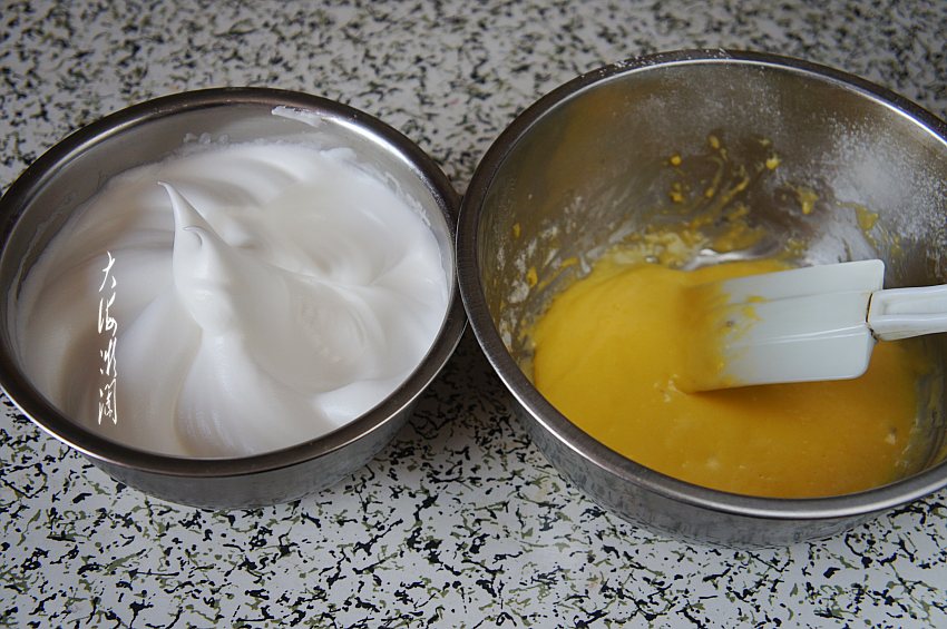 将打发好的蛋白霜分三次加入到蛋黄液中,以“之”字形切拌均匀,记住是切拌而不是搅拌。切拌蛋糕液的同时,蒸锅中加入适量的水,开火烧水,记住多加点水,大火蒸的时间长。