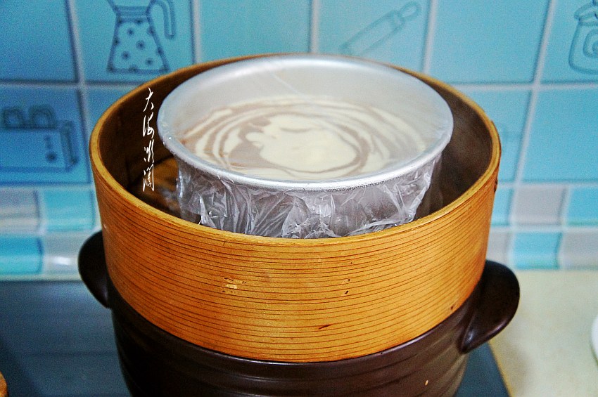 将装有蛋糕液的模具包上保鲜膜,用牙签扎几个小孔透气,水开入蒸屉,水量一定要加足,全程大火蒸40分钟。