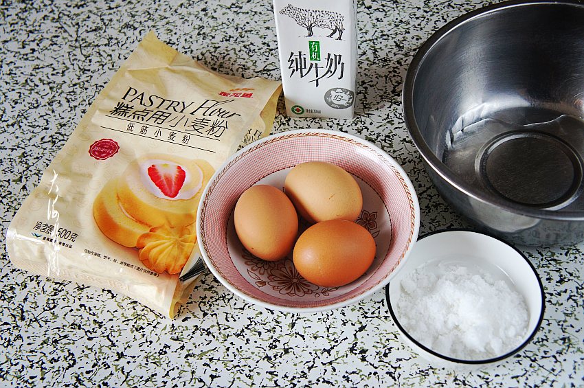备齐材料,鸡蛋3个,选大个并且新鲜的鸡蛋,蛋糕粉或者低筋面粉都可以,我今天用的是金龙鱼糕点用小麦粉。牛奶可以用果汁或者清水代替,当然用牛奶更滋补。