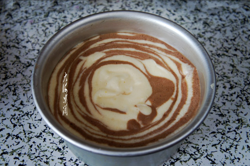 今天用的是6吋活底蛋糕模具,底部铺上油纸更容易脱模。模具薄薄地刷层油,用相同大小的勺子将其中一份原味面糊往模具中倒一勺,再倒入一勺可可面糊,再原色面糊再可可面糊,这样重复直至全部倒入模具,轻震一下,去除大气泡。