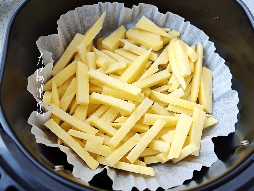 捞出土豆条控净水分,送入空气炸锅,200度炸15分钟,中间注意翻动两次,让土豆条受热均匀,无需加油,土豆这样做,当主食更健康,我家小朋友都爱这么吃。