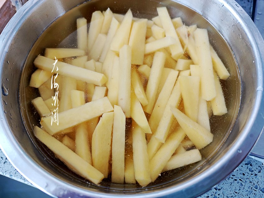 土豆去皮洗净切条,冷水浸泡出淀粉,这一步不能省,既有利于健康还有利于减肥。