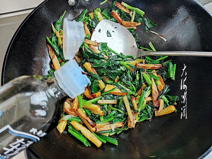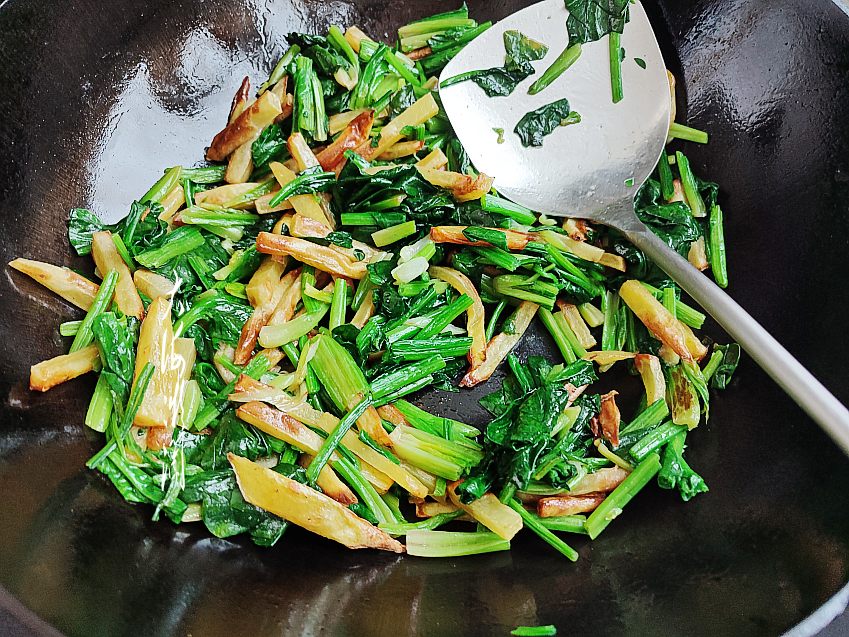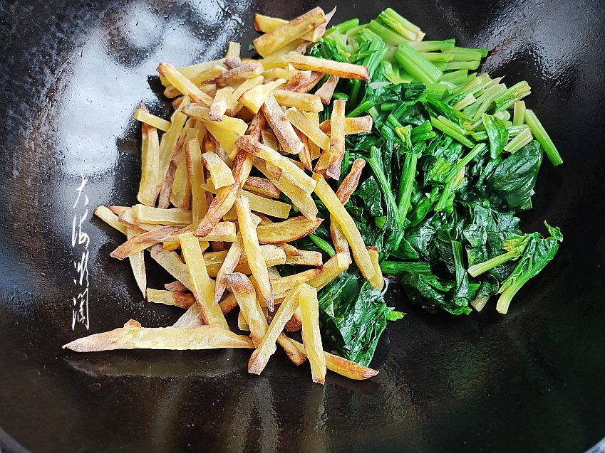 炒锅加入适量的油,爆香五香粉和葱花,下入准备好的菠菜和土豆条翻炒。