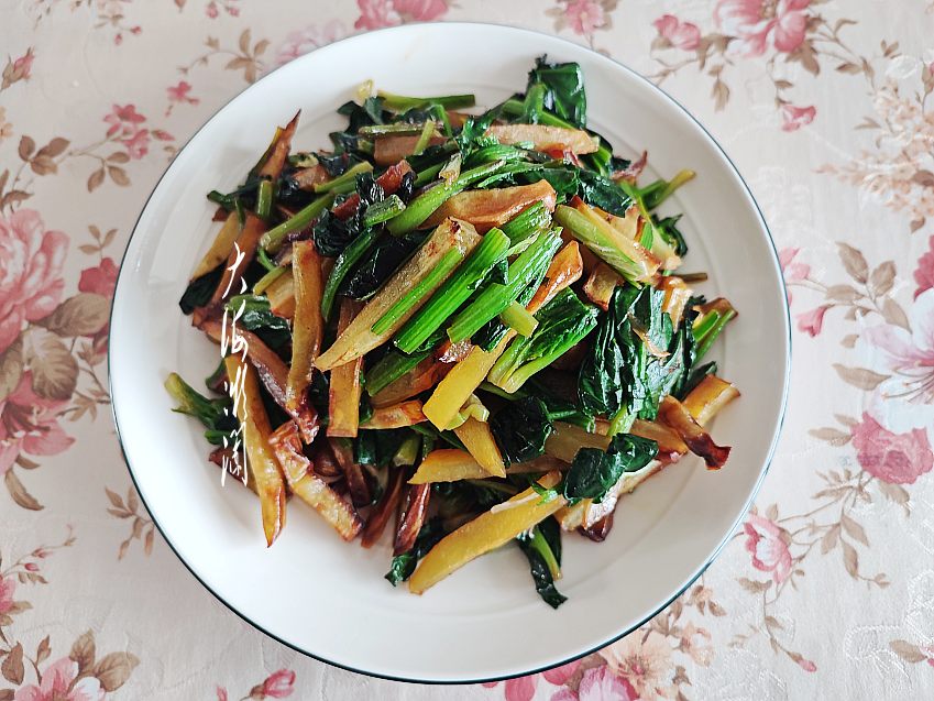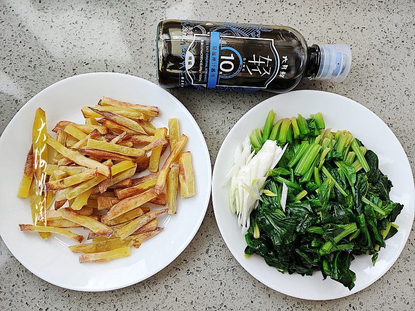 【菠菜土豆条】所需食材:菠菜1把;土豆1个;油适量;五香粉适量;葱适量;六月鲜10克轻盐原汁酱油适量。