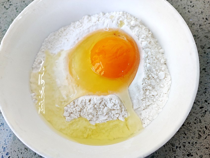 取大一点的容器加入面粉,打入1个鸡蛋,如果不用牛奶的话,可以打入两个鸡蛋。然后加入牛奶,搅拌均匀。
