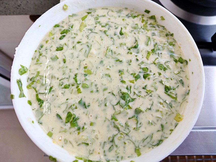 面糊中加入生菜、葱花、胡椒粉搅拌均匀。生菜还可以换成各种时令新鲜蔬菜,增加营养,补充维生素,换着花样吃,孩子吃不腻。