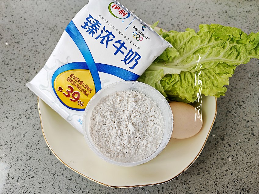 【快手早餐饼】所需食材:鸡蛋1个;牛奶1包;面粉1杯;生菜心1个;葱适量;油适量;盐适量;胡椒粉适量。