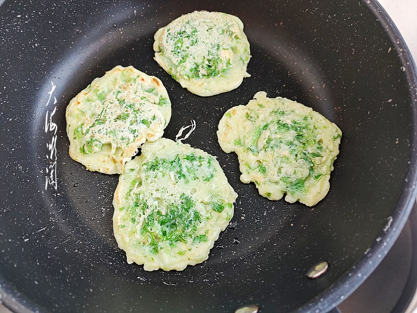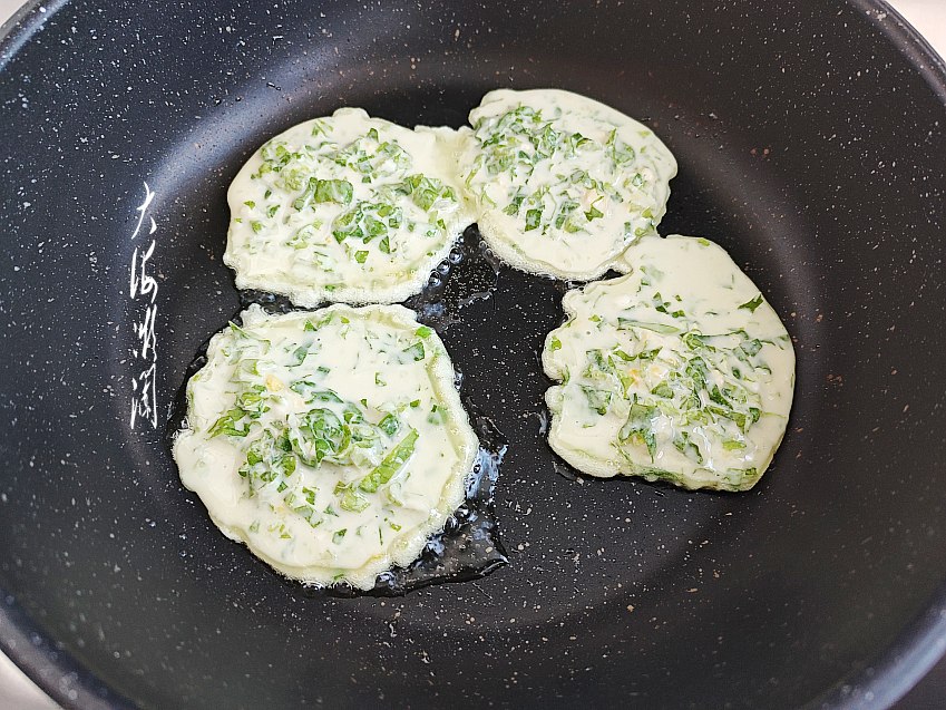 最好用平底锅烙,没有平底不粘锅用大勺也是可以的,注意小火就好了。锅中少许加点油,用汤匙舀1汤匙面糊倒入锅中,一勺一个饼,小火烙。