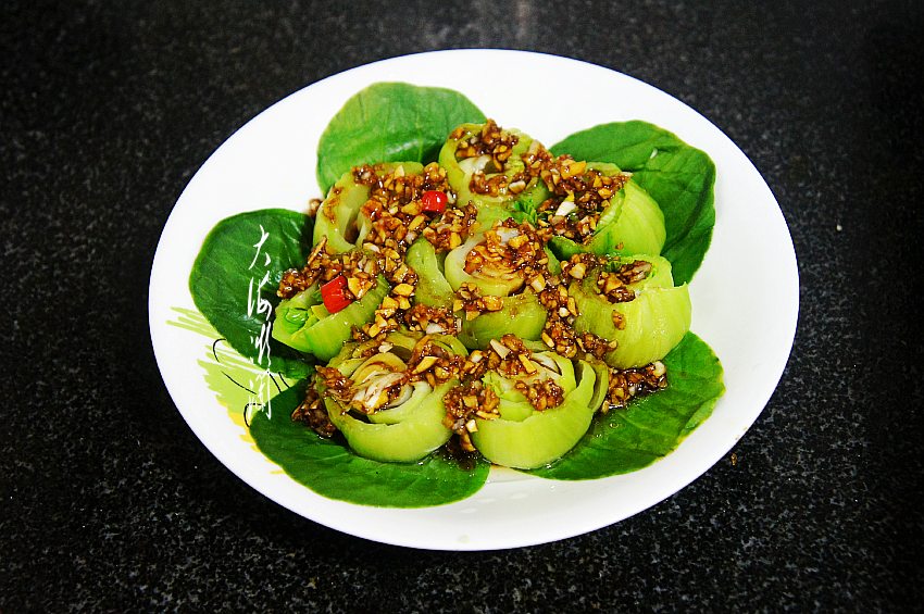 做法:所有食材洗净,油菜根大一点切下来,修剪一下,用于造型,然后焯水,焯烫至断生,油菜叶子焯烫一下,变色即可捞出过冷水,再沥干水分。码盘,先码叶子后码根部造型。