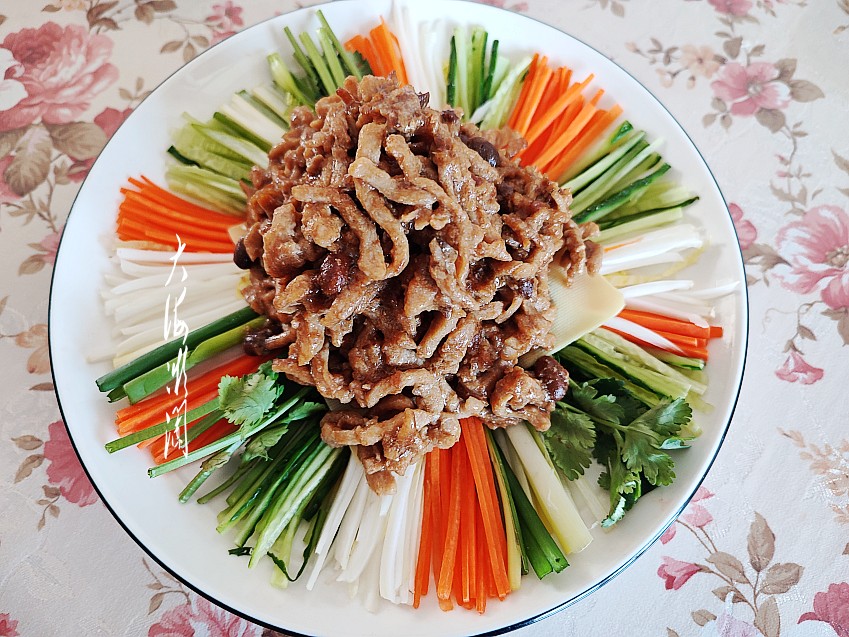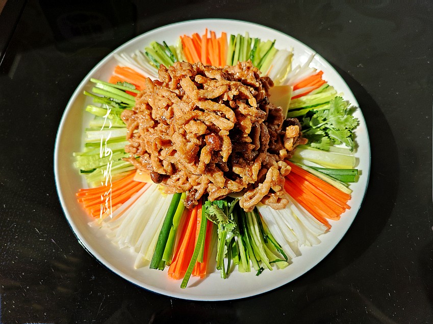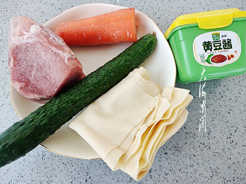 【京酱肉丝】所需食材:里脊肉300克;油、、生抽、料酒、淀粉、香葱、姜、六月香黄豆酱、黄瓜、白糖、白菜心、香菜、胡萝卜、干豆腐各适量。
