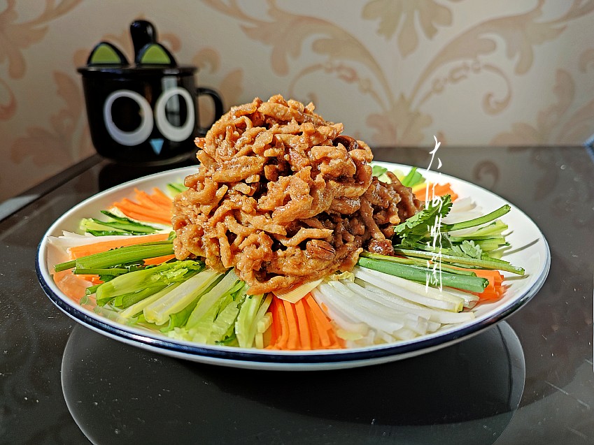 京酱肉丝,一道知名度很高的美味佳肴,是京菜中的经典代表菜之一。主要食材是猪里脊肉,别看姐的做法简单,它可是咸甜适中,肉丝鲜嫩,酱香浓郁的一道家常菜。按姐的做法,没有难度,谁都会做,猪里脊肉切丝加点料酒、生抽和淀粉腌一下,只用一勺酱,再用北方特有烹调技法"酱爆"而成。与干豆腐是绝配,豆皮卷上京酱肉丝,大葱,黄瓜丝等,真是太好吃了,多吃也不怕胖,当午餐可是能量满满。不但补充蛋白质,还能补充钙质,好吃又有营养。