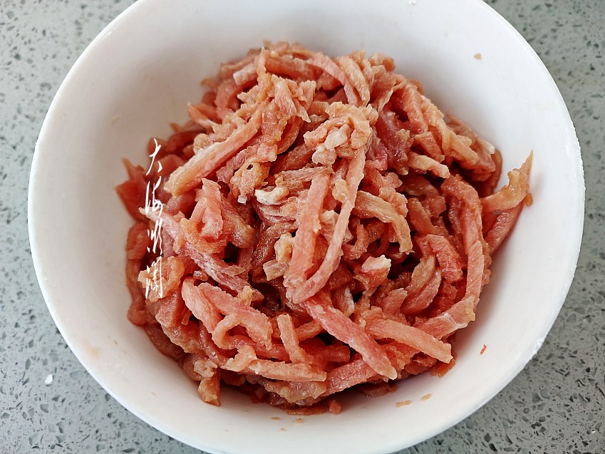 里脊肉洗净,去掉筋膜,切成丝,粗细可根据自己喜欢的口感而定。加入生抽,料酒,淀粉、少许油,搅拌均匀后腌制10分钟左右。