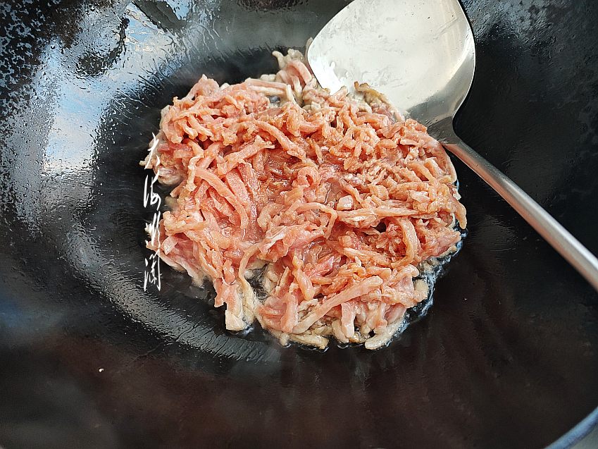 锅中加入适量油,油温大约烧至7成热,滑入腌制好的肉丝快速滑散,翻炒至肉丝变色后取出备用。