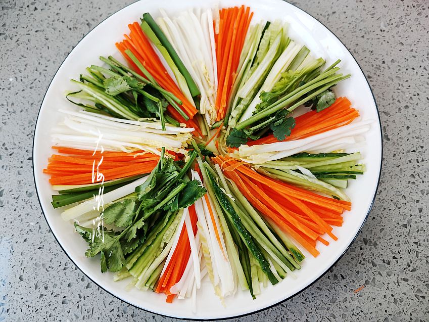 黄瓜、白菜、香菜、香葱用蔬菜清洗剂反复清洗干净,分别切成细丝,香菜、香葱切段。胡萝卜去皮洗净切细丝,喜欢脆嫩的口感不用焯水,胃肠不好的可以焯水。然后码盘,按照自己喜欢的颜色搭配。