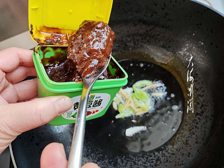 锅中留底油,爆香葱姜,然后取出扔掉,今天没有提前浸泡葱姜水(最好浸泡葱姜水,直接加葱姜水调成酱汁),加入1大勺六月香黄豆酱爆出酱香味,然后少许加点水、料酒,白糖翻炒均匀。