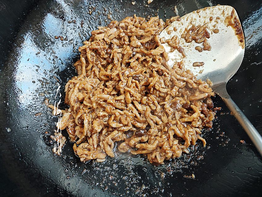 最后倒入肉丝继续翻炒至肉丝均匀裹上酱汁。