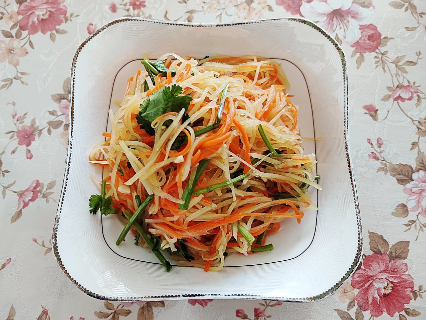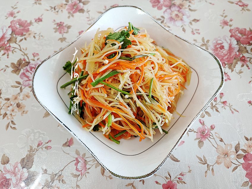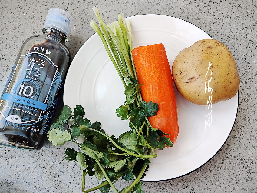 【凉拌土豆丝】所需食材:土豆1个;胡萝卜半根;蒜适量;六月鲜10克轻盐原汁酱油适量;醋适量;香菜适量。