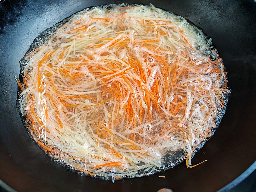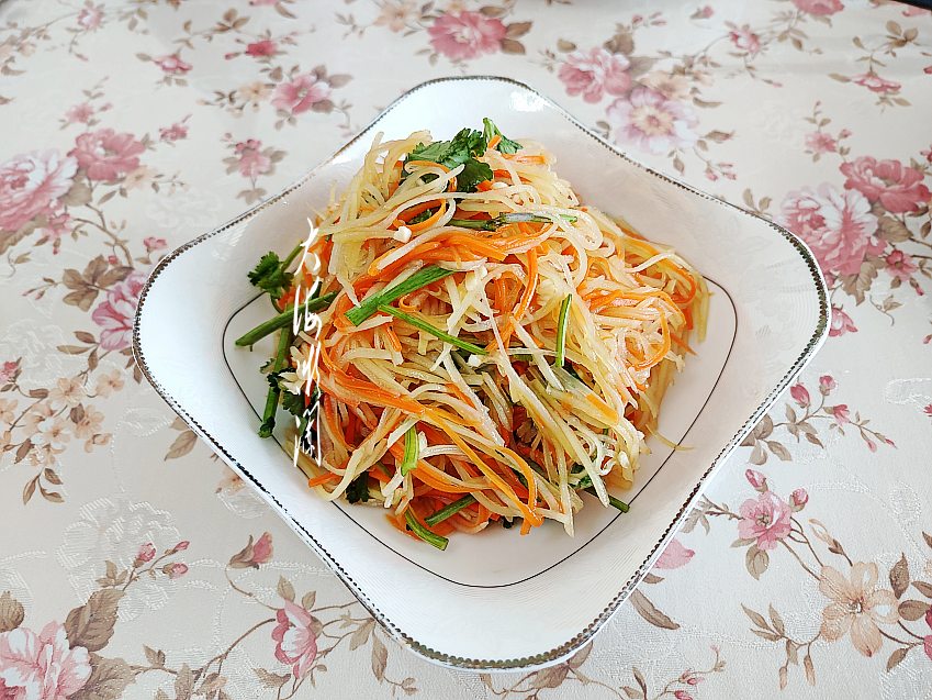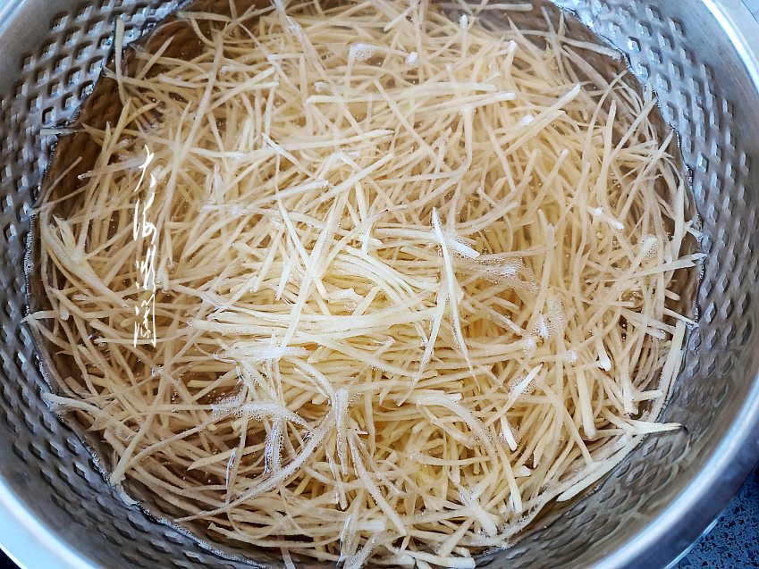 锅中加入适量的水,大火烧开,水开下入土豆丝和胡萝卜丝焯水,焯水时间的长短视土豆丝的粗细和量的大小而定,焯熟即可。今天的土豆丝很细,2~3分钟就好。然后捞出过冷水,控净水分。