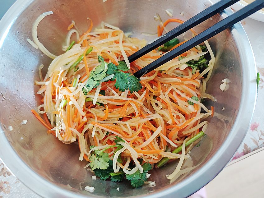 香菜切段,大蒜去皮洗净切末,所有准备好的食材加入盆中,倒入调味料拌匀就OK了,凉拌土豆丝就做好啦。