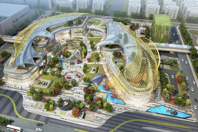 在建筑的中心位置,你会看到“双鱼”环抱着下沉的绿化广场,让自然光从四边线渗入整个商场之中。柔和的绿化墙及布满植物的小径遍及公园每个角落,配上悦目的水池景观,宛如城市中央的公园。多层次的立体绿化空间,打造出别具一格的风格。