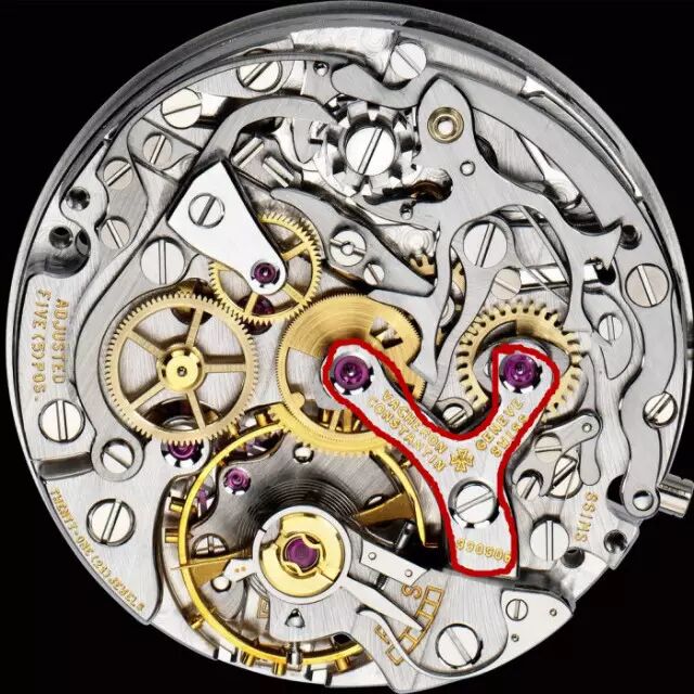 在计时传动过程中,计时秒轮需要一个离合轮与中央秒轮连接。为了更好地达到齿轮之间的咬合,制表师可以通过这个机构来调节秒轮与离合轮的间隙。如今,只有PATEK PHILIPPE与A. LANGE & SÖHNE的手动计时机芯上还可见到这样的结构。