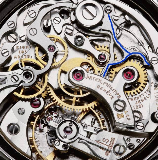这样的设计不仅是由于考虑到前面所说的分钟计时可选的原因,并且1920年代初的钟表制造依然仰仗制表师的双手,即使同一型号机芯,零件的所处位置都会有些许不同。随着PATEK PHILIPPE的第二代计时机芯(VZ23)开始,加工精度的提升,以及分钟计时功能成为标准配置,归零锤最终演化为我们今天熟悉的“人”型钢件。(注:虽然dato是分离式计时夹板,但是归零锤依然是一体化的。)