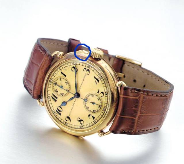 编号198055,于1927年出厂,表冠侧依然保留着怀表时期典型的计时按键保险机构(篮圈处)