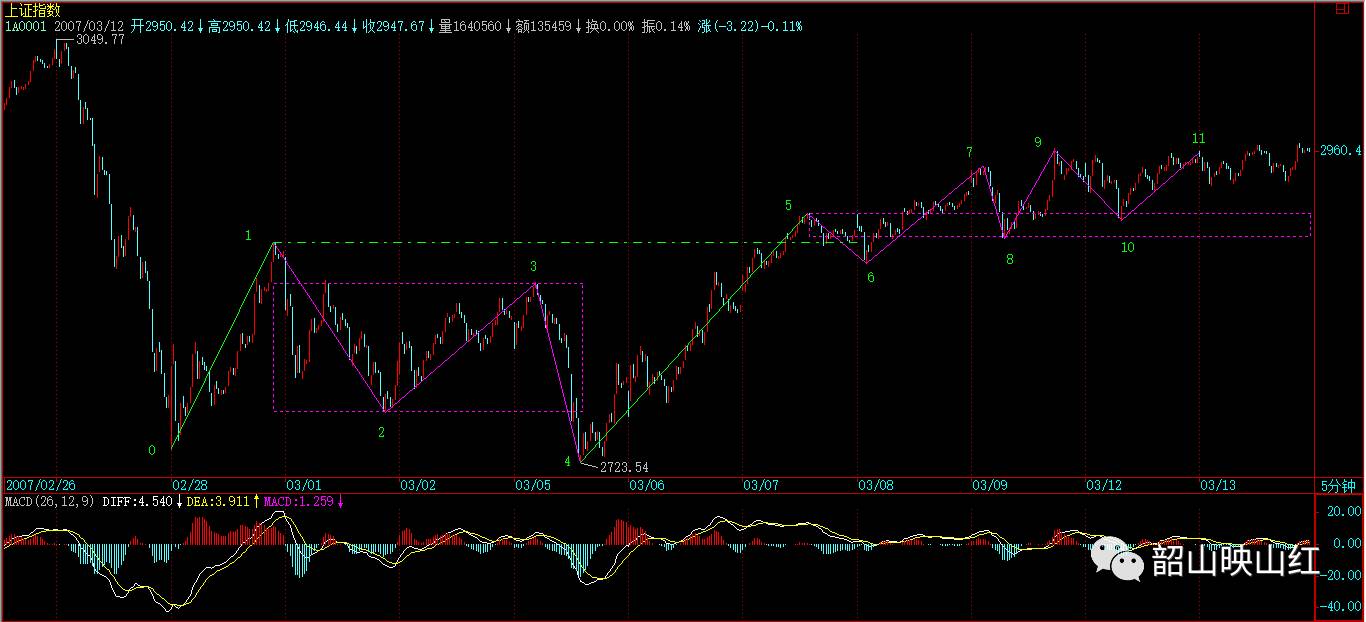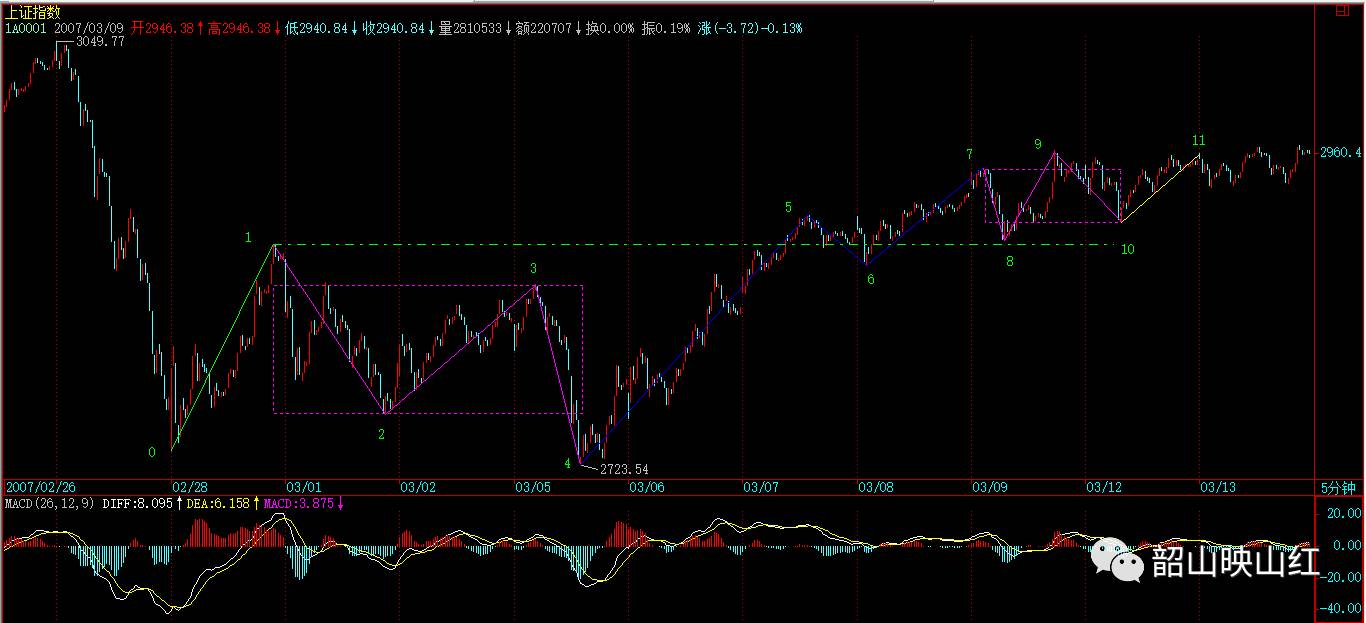 但必须强调的是,当下采取什么组合,就要按该种组合的具体图形意义来判断、操作,【韶山映山红】组合的目的只是为了指导实际的操作。】例如,现在把03.09 10:30当成新30分钟中枢的起点,那么中枢的位置就变成2947到2905,这样后面第三类买点的位置就有了新的标准。【韶山映山红】中枢7-8-9-10的区间是[2905,2947]。后面第三类买点的新的标准就是回踩不进中枢7-8-9-10的这个区间,要高一些了。】