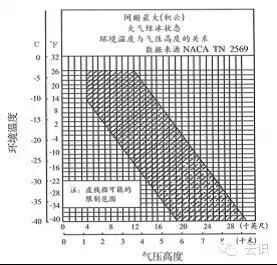 图4给出了间断最大结冰天气条件的高度-温度包线范围,由图可知这种结冰天气的云层可能在海拔高度9km以下以及飞行高度处大气温度-40℃~0℃范围内出现,这比连续最大结冰条件可能出现的高度-温度范围大。