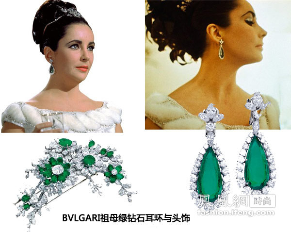 李察波顿(Richard Burton)1962年买下宝格丽BVLGARI祖母绿钻石胸针,赠给一同在意大利Cinecitta拍摄《埃及艳后Cleopatra》的玉婆,18.61克拉祖母绿环绕梨形切割钻石,伊丽莎白泰勒多次配戴,例如电影《The V.I.P.s》与结婚当天的黄色雪纺纱礼服肩领上扣着的就是BVLGARI祖母绿钻石胸针。