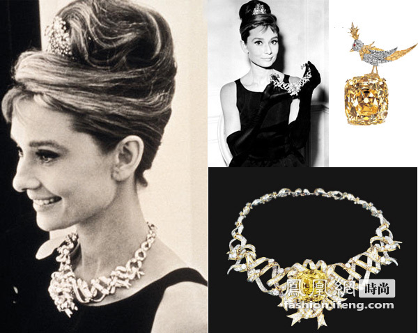 Audrey Hepburn佩戴Tiffany珍珠黄钻项链的经典画面早已成为影史的永恒瞬间,这颗黄钻重达128.54克拉,乃是当时最大且级质最佳的天然黄钻之一,于1877年开采出来,隔年便被Tiffany购得,由有“珠宝诗人”之称的天才设计师Jean Schlumberger设计为Audrey Hepburn颈上奢华,完美诠释女人对美好生活与真爱的向往,也让Tiffany在好莱坞知名度大开,之后又经过多次设计修改,最后成为今日熟悉的Tiffany镇店之宝“石上鸟(Bird on a Rock)”。
