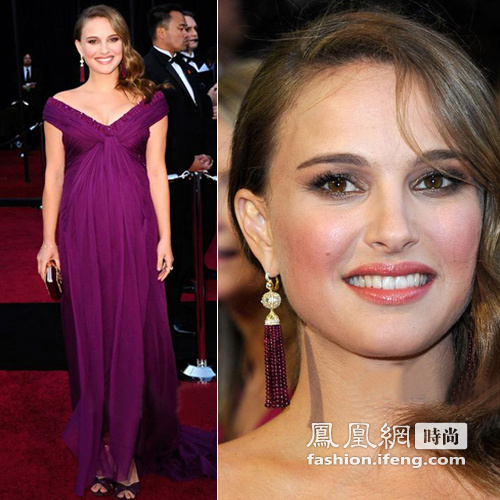 娜塔丽·波特曼(Natalie Portman) 同样选择佩戴与紫色礼服裙色调相近的红宝石流苏耳环亮相蒂芙尼(Tiffany) 红宝石流苏耳环与身上礼服裙大V领的设计将娜塔丽·波特曼(Natalie Portman)整个人凸显的高贵无比。
