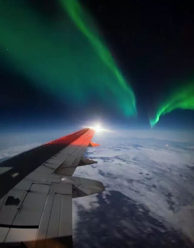 海斯特经常飞长途,一般有3个或更多的飞行员,这让他有机会走动,拍到满意的照片,例如下面这张从波音737客机机翼附近拍到的北极光的照片。他说,北极光非常亮,有时候仅需要几秒钟的曝光时间。