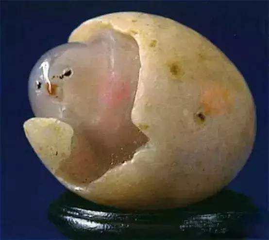 现收藏于北京朝阳区人民政府,小鸡出壳为天然玛瑙奇石。此石似一只色泽淡黄毛茸茸的小鸡从蛋壳内向外张望伸头欲出,形象逼真,色泽艳丽,“小鸡出壳”整体的造形以及局部的体态都与实物相仿。