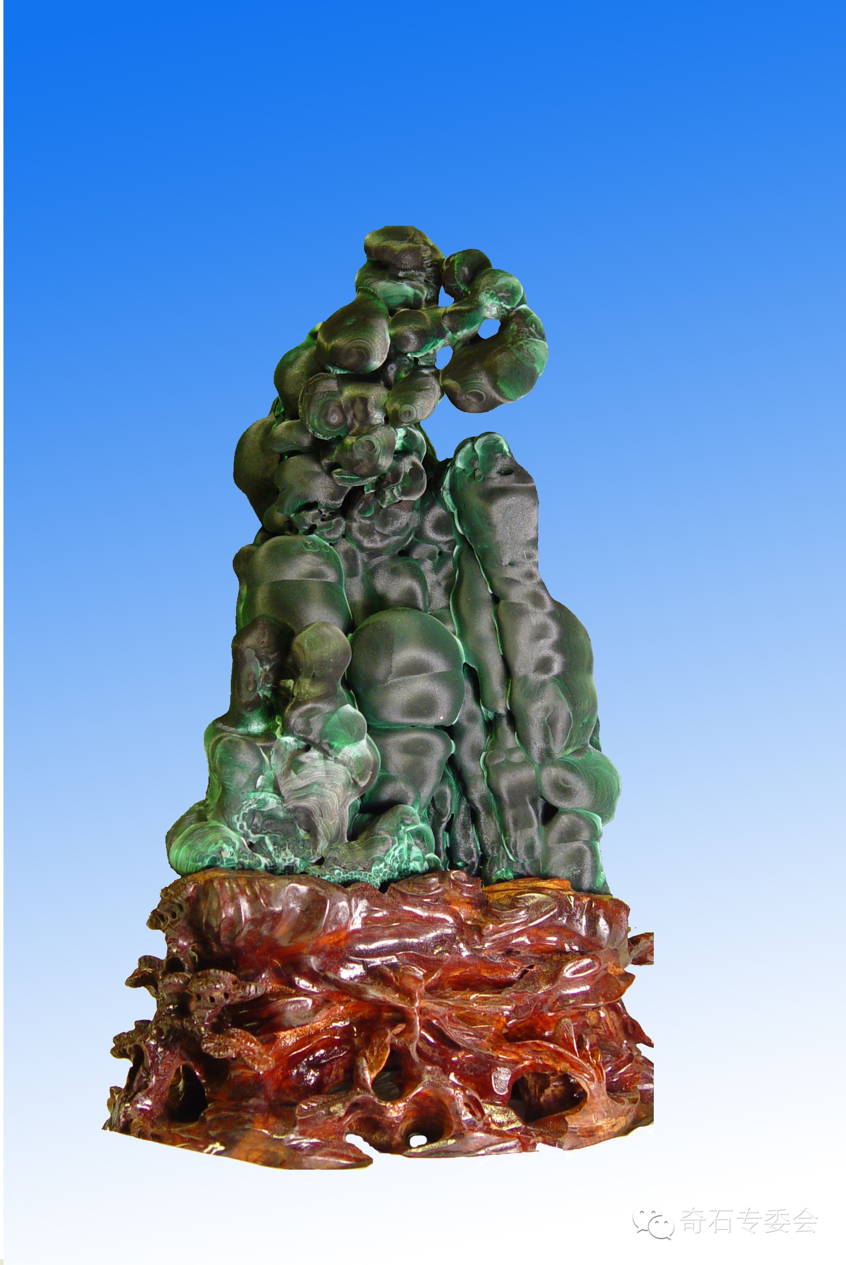 现收藏于北京藏家手中,是一枚闪烁着绿色梦幻光泽的孔雀石,产自广东阳春,是含铜碳盐的蚀变产物,呈不透明的深绿色,且具有色彩浓淡的条状花纹。细看,石表散发荧荧幻彩,变换角度看上去,象丝丝绸缎。“仙山”代表着现代人的一种环保期盼,也是自然和谐的一个美丽象征。同时在在2008年被评为十大国石之一。据本草纲目记载,孔雀石是一种极为珍贵的药材,主要用于治疗眼疾;曹雪芹和郭沫若生前酷爱收藏此石。