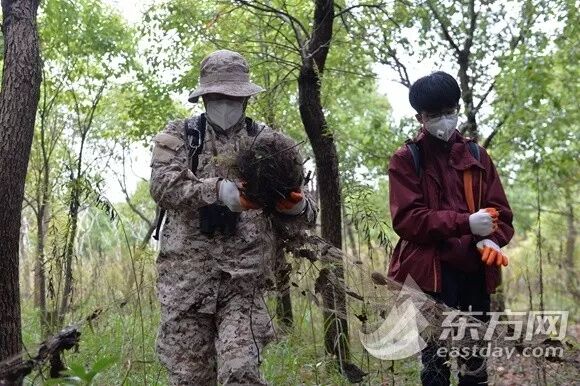 在一处密林里,护鸟志愿者队伍发现了一堆灰色羽毛。朱维佳立刻判断这附近百分百有捕鸟网。“这会不会是附近的猫、狗吃掉的?”来自上海中学的一名学生志愿者询问。“不会,因为看现场痕迹,就知道是捕鸟人将羽毛拔光的,而且时间应该不长。”