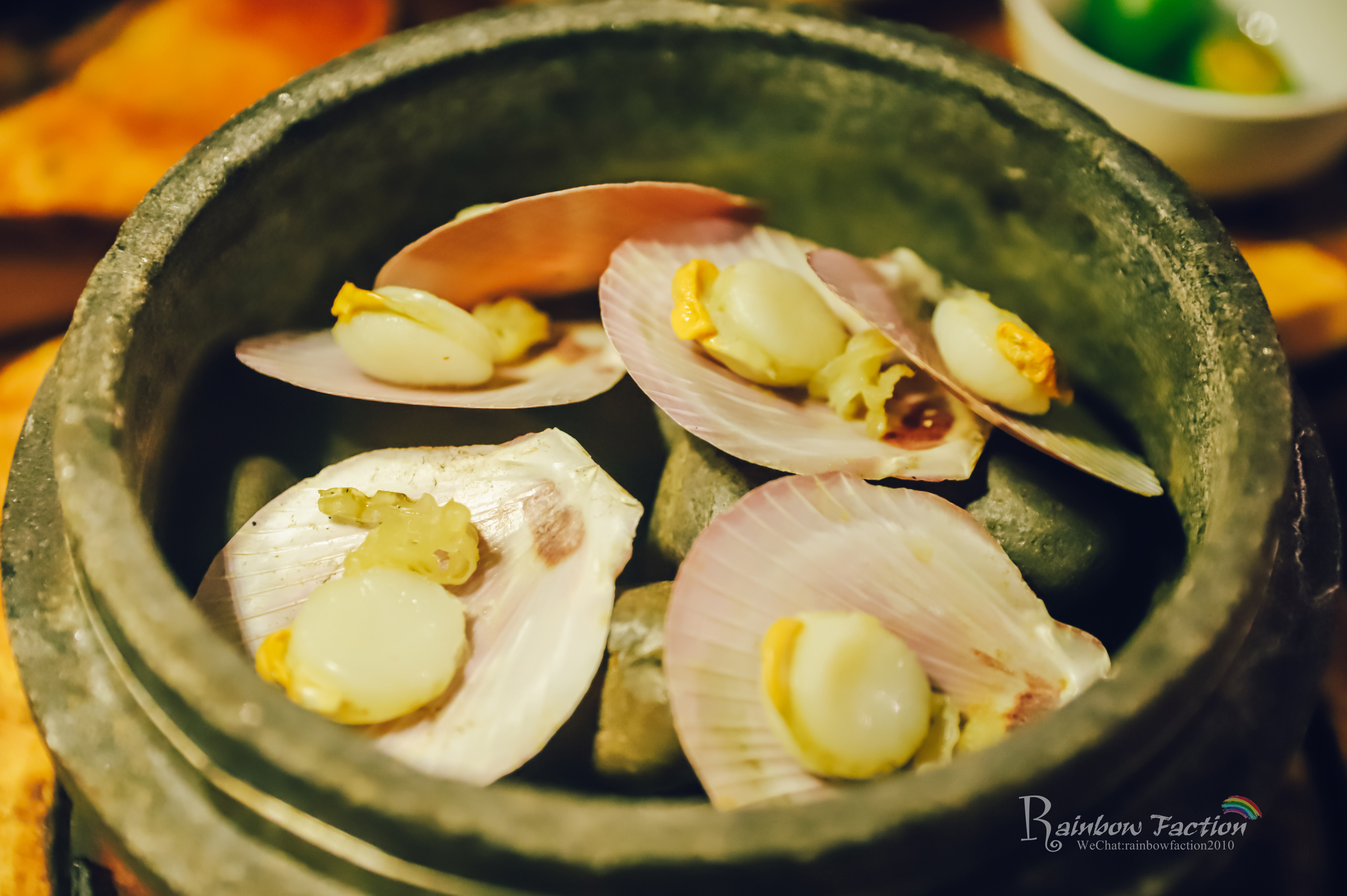 石锅用滚烫的石子保温,扇贝与生蚝得意保留了最原始天然的味道。